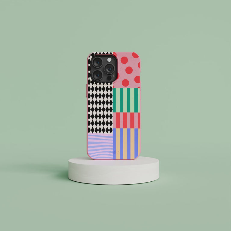 Get ready to turn heads and drop jaws—this case is a showstopper! Inspired by the electric energy of a carnival, Juggling Colors brings together bold harlequin diamonds, playful polka dots, and a vibrant mix of stripes in a patchwork of fun. It’s like a circus for your phone, minus the elephant in the room (aka plastic waste).