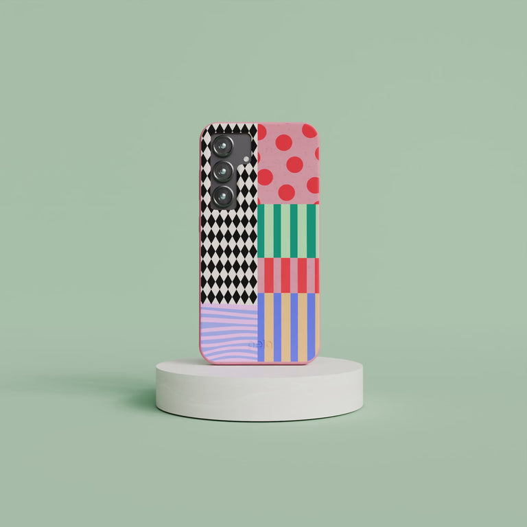 Get ready to turn heads and drop jaws—this case is a showstopper! Inspired by the electric energy of a carnival, Juggling Colors brings together bold harlequin diamonds, playful polka dots, and a vibrant mix of stripes in a patchwork of fun. It’s like a circus for your phone, minus the elephant in the room (aka plastic waste).