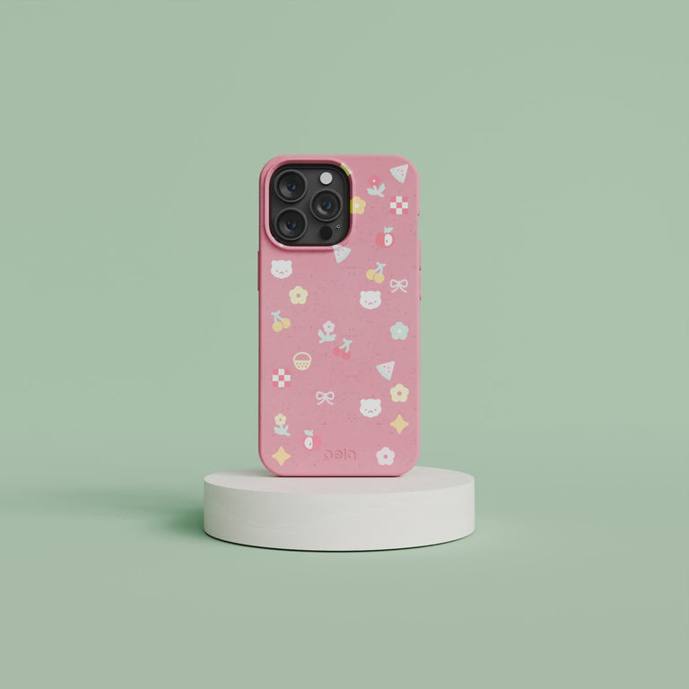 Protect your phone in style with the Bubblegum Pink Pretty Picnic Case from our Pela x yeunglove Artist Series Collection. This sustainable, durable, and compostable phone case is inspired by spring and features lil' bows, cherries, baskets, watermelons, flowers and more. Keep your phone safe while adding a touch of whimsy to your everyday life.