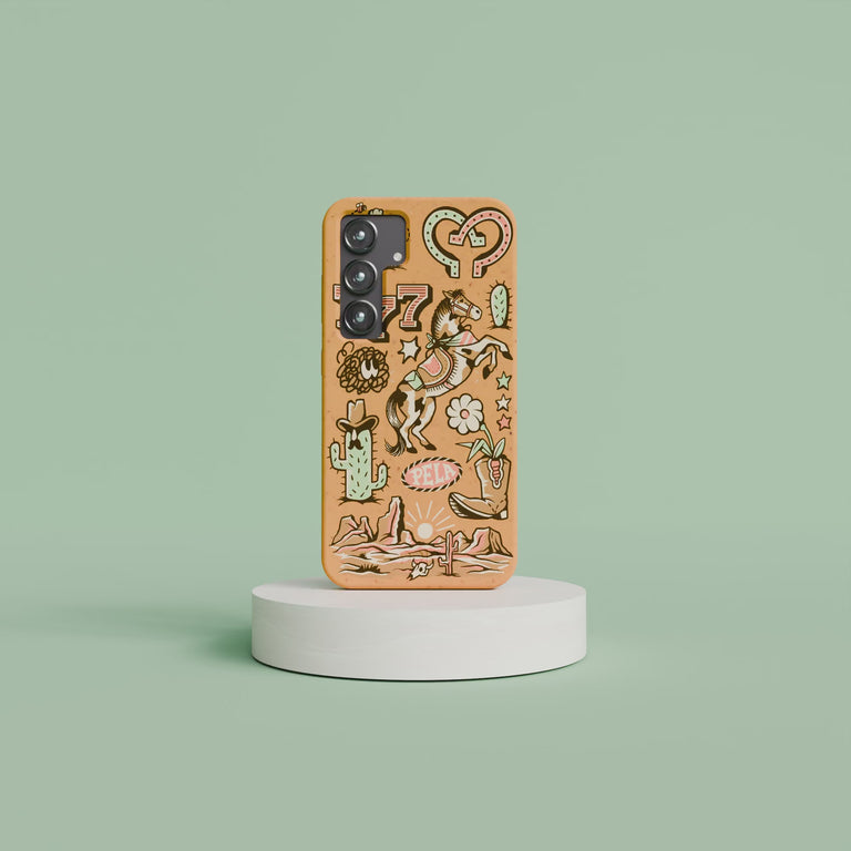 🌵🤠 Saddle up your phone with the Miller West Phone Case, part of the exclusive Pela x Cam Miller Artist Series Collection! Bursting with Wild West charm, this case features a delightful mix of cowboy hats, cacti, horses, and lucky sevens, all illustrated in Cam Miller's signature style. The vibrant hues and playful design capture the spirit of the open range, bringing a touch of western whimsy to your everyday tech. Perfect for those who dream of dusty trails and desert sunsets, the Miller West Phone Case is your trusty sidekick for all your digital adventures. Yeehaw! 📱🌞🐎