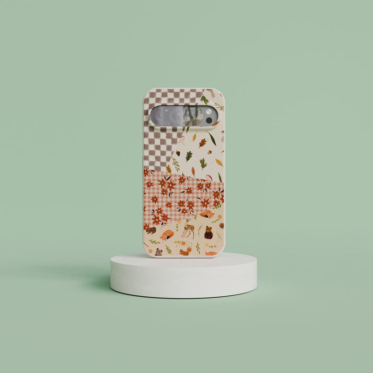 Envelope your device in the warmth of the Autumn Quilt Phone Case from our Cozy Core Collection, where the essence of fall is captured in every stitch of its design.  This case blends a checkered pattern with the natural tapestry of fall, featuring crisp leaves, acorns, and the fauna of the forest. Each segment is like a patch in the quilt of autumn, telling a story of harvest and harmony.  🍂📱🧡