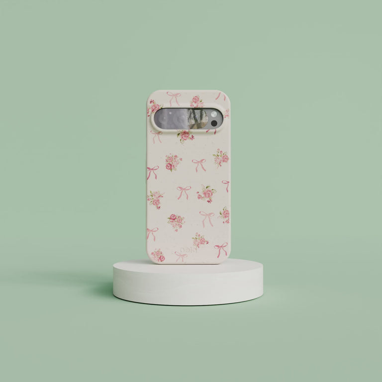 Step into a world where elegance meets sustainability with the Pela Roses and Bows Phone Case. Designed to charm and protect, this case features delicate roses and whimsical bows scattered across a warm, seashell-toned background, invoking the beauty of a blooming garden. 🌹🎀🌍