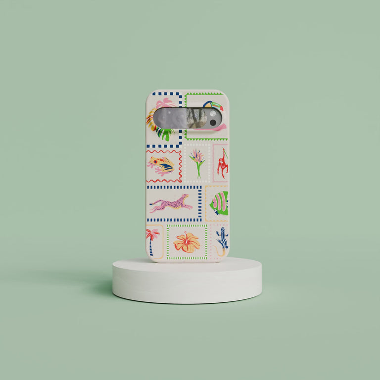 Escape to your own island adventure with the Tropical Paradise Phone Case! This vibrant and playful design features a colorful mosaic of tropical delights, from exotic birds and leaping jaguars to blooming flowers and lush foliage. Set against a soothing seashell background, each stamp-like square transports you to a different corner of paradise. Let the tropical vibes inspire your wanderlust and brighten your day! ๐ดย ๐ฆ๐